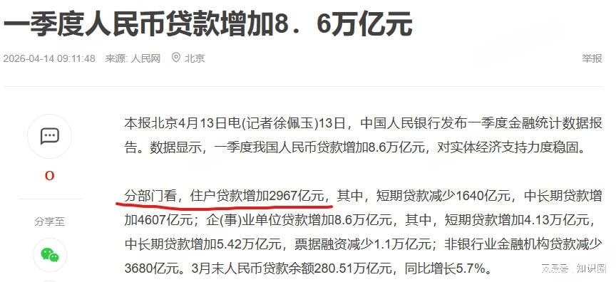 2022年至2024年,虽然有所反复,但整体已经进入震荡下行阶段。到2025年,居民新增贷款已经降至约1.04万亿元,而2026年一季度则进一步大幅下滑到2967亿元,创下近年来极低水平。