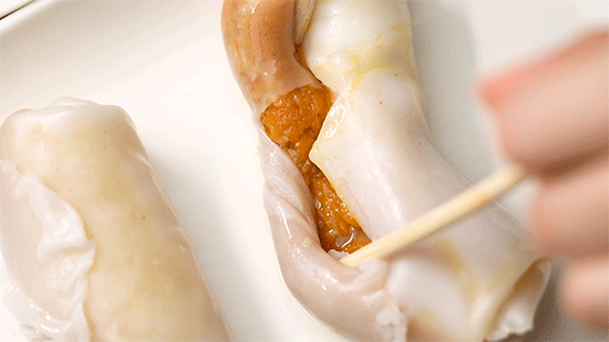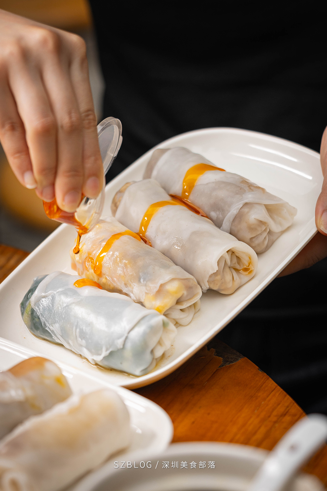 “我们店里的捆粿是不用加任何酱汁的,馅料炒好已经够味了。有些客人吃得比较咸,我们就会再加点肠粉的酱汁给他。”
