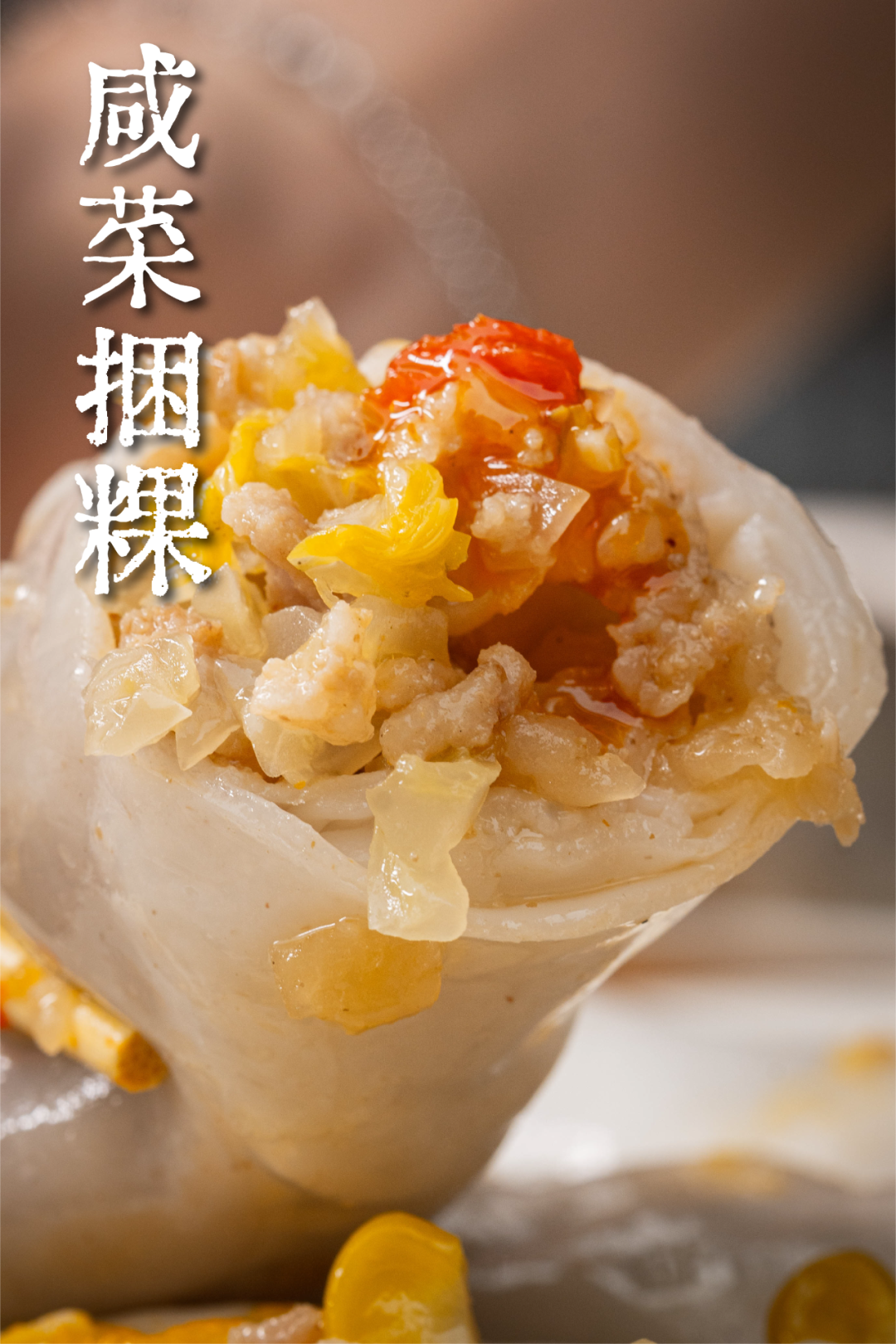 粿皮蒸出来,透亮透亮的,软糯中带着微微的Q弹。黄叔说,皮越薄、捆粿才越好吃。